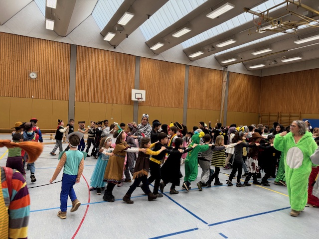 Am letzten Schultag vor den Faschingsferien wurde es bei uns noch einmal richtig bunt. In der letzten Stunde feierten wir gemeinsam eine fröhliche Faschingsparty. Mit einer langen Polonaise zogen alle Klassen durchs Schulhaus und weiter in die Sporthalle.