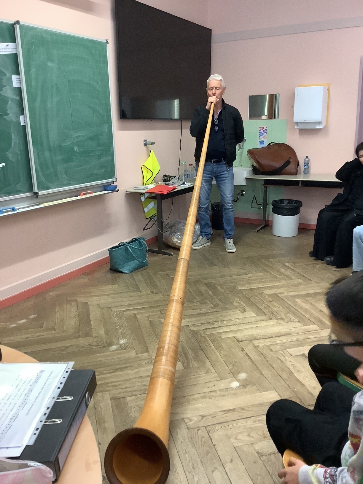 Herr Bänsch brachte nicht nur sein Horn mit, sondern auch ein beeindruckendes Alphorn, das bei den Kindern sofort für Staunen sorgte. Mit viel Begeisterung musizierte er für die Schülerinnen und Schüler und ließ dabei auch den Wolf aus "Peter und der Wolf" eindrucksvoll erklingen.