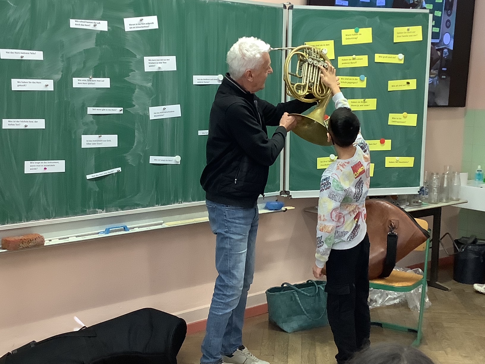 Herr Bänsch brachte nicht nur sein Horn mit, sondern auch ein beeindruckendes Alphorn, das bei den Kindern sofort für Staunen sorgte. Mit viel Begeisterung musizierte er für die Schülerinnen und Schüler und ließ dabei auch den Wolf aus "Peter und der Wolf" eindrucksvoll erklingen.